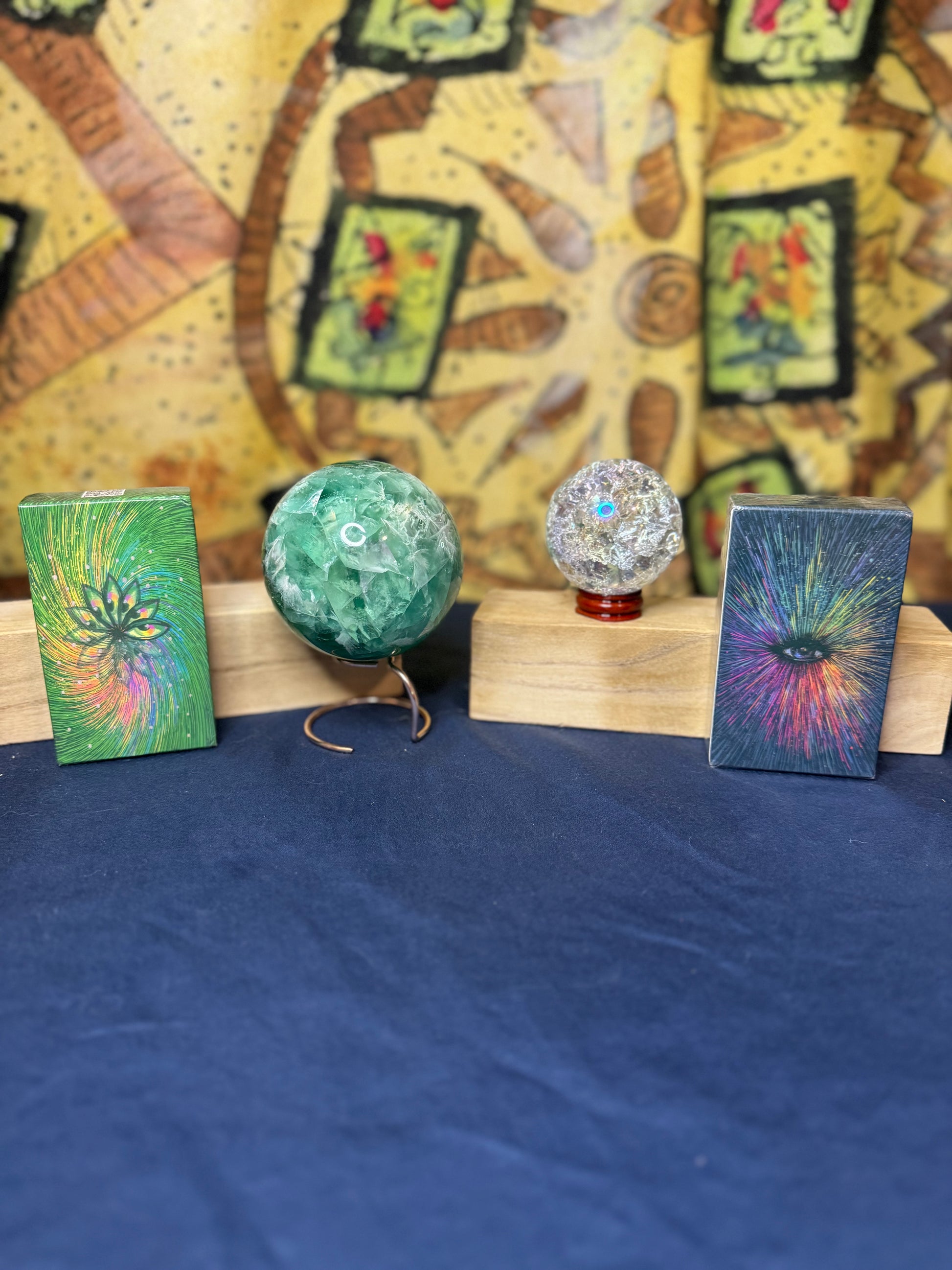 Enjoy this gorgeous fluorite sphere and tarot deck